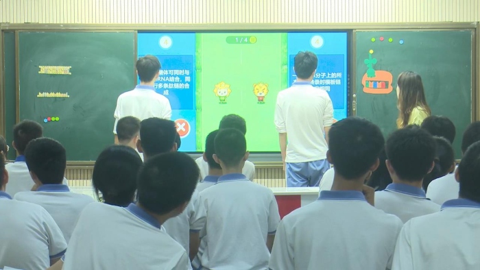 劉媛老師以代入研究人員角色為情境,引導學生思考如何批量、廉價生產胰島素。她以思考問題為切入點,設置五個課堂任務,鼓勵學生全員參與課堂互動和討論,融知識學習和社會實踐為一體。為達到鞏固知識的目的,劉媛老師利用希沃技術,將枯燥的解題設置為扣人心弦的短跑比賽,讓溫故知新的復習過程充滿了競技的樂趣。