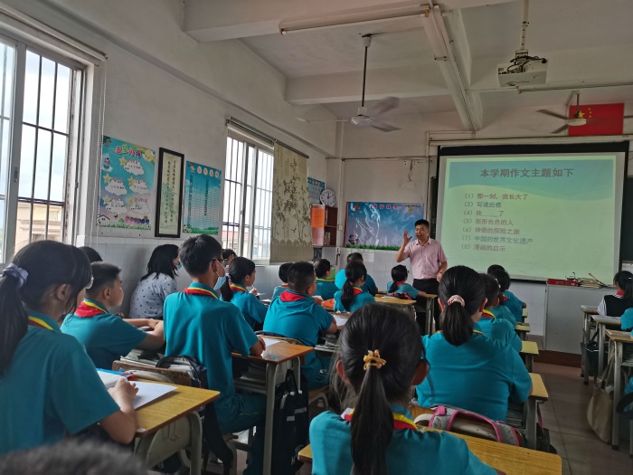 首先,郭老師對各位老師的到來表示歡迎,并向各位老師介紹了活動(dòng)的流程和舉行本次活動(dòng)的目的。接著,由五年級(jí)語文集體備課攻堅(jiān)小組的駐級(jí)行政楊順球主任向老師們展示了一節(jié)習(xí)作復(fù)習(xí)課。楊主任通過分析五年級(jí)下學(xué)期語文教材八個(gè)單元的習(xí)作主題和內(nèi)容,選出其中占比例最大的人物語言描寫部分作為要點(diǎn)跟學(xué)生進(jìn)行復(fù)習(xí)。課上,楊主任以提示語的使用為突破點(diǎn),通過教材中課文的內(nèi)容分析、微課視頻、圖片等方式,步步深入,層層遞進(jìn),引導(dǎo)學(xué)生如何用巧妙地用提示語進(jìn)行語言的描寫。從學(xué)生當(dāng)堂寫作的反饋來看,學(xué)生能靈活運(yùn)用提示語寫作,寫出來的段落更加詳細(xì),效果較好。