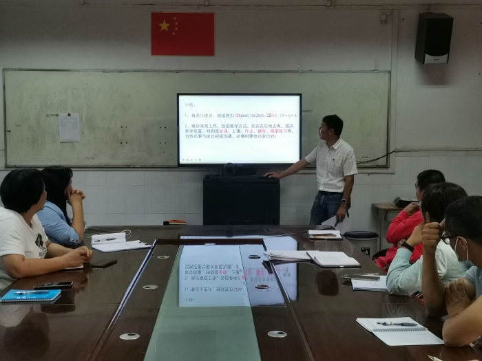 教導處楊順球主任首先對2021-2022學年度下學期期末檢測中各年級各學科成績進行了具體系統的分析。在分析中用具體的數據說話,通過對各年級各科合格率、優(yōu)秀率、年級平均分跟本班上學期成績的對比,跟鎮(zhèn)的平均數據進行對比評價和分析,真實呈現了各年級各學科期末考評結果,讓老師們明確現狀,看到成績和差距。針對各科存在的問題提出了今后的教學建議和改進措施,要求做到以下幾點:一、明確目標,樹立目標意識。二、要抓常規(guī)、抓紀律,常規(guī)要落實到位。三、要培優(yōu)輔差,抓學習細節(jié)。接著楊順球主任生動形象地介紹了“家”字的由來,“家”字的意義,勉勵大家要以校為家群策群力提升教學質量。