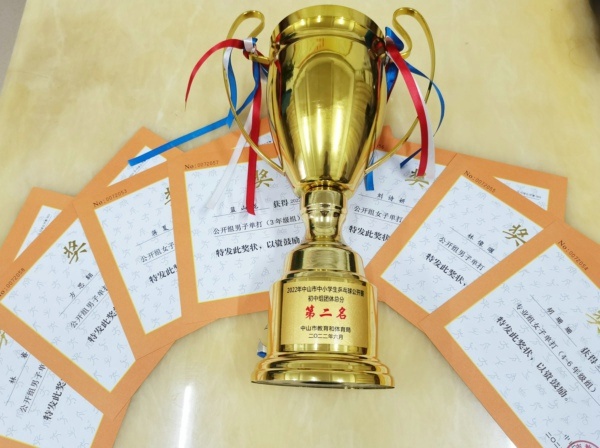 2022年中山市中小學(xué)生乒乓球公開賽于2022年6月25日—26日在中山市乒乓球館舉行,錦標(biāo)學(xué)校乒乓球隊在76所中小學(xué)校中頑強拼搏,再創(chuàng)佳績。本次比賽共有7人進入各組別單打前八名,小學(xué)組榮獲團體總分第四名,初中組榮獲團體總分第二名。