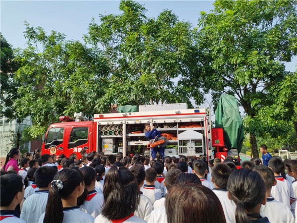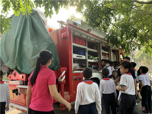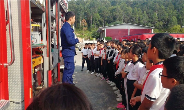 整個演練活動共分四大流程:一是易思副校長詳解本次演練活動;二是疏散演練;三是南朗鎮(zhèn)消防官兵指導(dǎo)教師們?nèi)绾握_使用后滅火器;四是學(xué)生分班級參觀消防車內(nèi)裝備、體驗經(jīng)過模擬火災(zāi)現(xiàn)場。