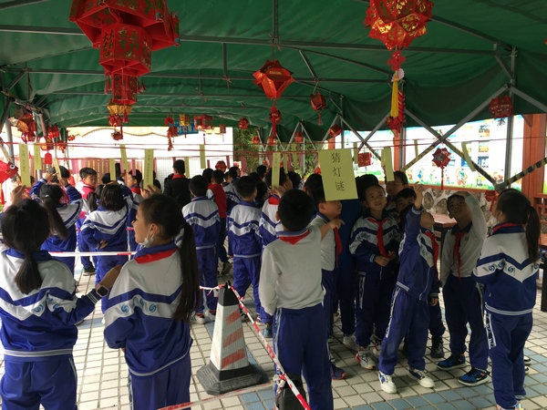看!橫門(mén)小學(xué)剛進(jìn)校門(mén)處懸掛著精美的花燈。據(jù)悉,這些花燈是學(xué)生們?cè)诩易儚U為寶制作出來(lái)的,精美且環(huán)保,非常有創(chuàng)意。在德育處的組織下,各個(gè)班級(jí)分別進(jìn)行猜燈謎的活動(dòng)。五彩的燈謎懸掛在花燈下,“半青半紫。(打一字);鳳凰臺(tái)上鳳凰游 (打數(shù)學(xué)名詞一)……”每個(gè)燈謎都那么好玩有趣。孩子們穿梭于花燈間,猜出來(lái)的,歡呼雀躍;猜不出的,緊皺眉頭。