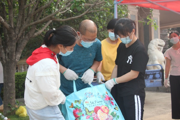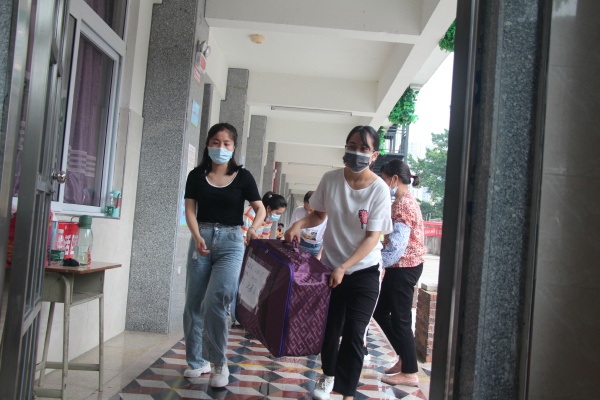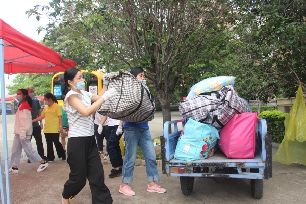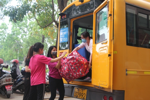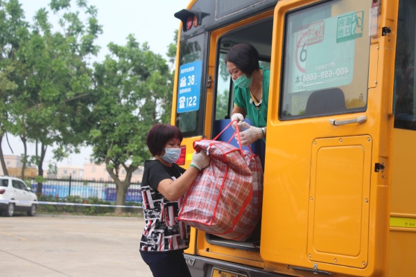 5月13日上午8點,教學區(qū)沒有課的老師和生活老師老師、還有安保人員準時到位,等待學生家長運送行李的到來。從學校門口到物資制定交接點,都規(guī)劃好了統(tǒng)一的路線,嚴格規(guī)定了人員之間的距離。從門口處消毒,到學生行李接收等都做了具體細致安排。家長按照規(guī)定時間陸續(xù)到來,送下行李后迅速離開,由班級相關(guān)老師負責接收,貼上標有班級、姓名、宿舍號和床位號的標簽,由專人對每個學生的行李進行消毒處理,再搬運到指定消過毒的運輸車上,安全把行李到達宿舍,由責任教師將學生行李安排到指定床位。