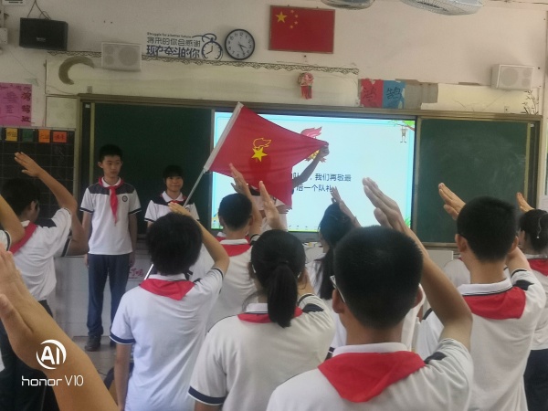 接著,全體隊員重溫入隊誓詞,由離隊隊員代表初二(8)班白軒怡同學(xué)發(fā)言,她說:“回顧在少先隊的日子,是難忘而快樂的。忘不了在入隊儀式上,我們莊嚴的宣誓;忘不了那已行過無數(shù)次的少先隊隊禮;忘不了那已在胸前佩戴過無數(shù)次的鮮艷的紅領(lǐng)巾……"