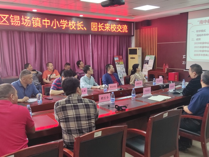 隨后,林潔聰組長(zhǎng)一行來到學(xué)校會(huì)議室,聽取了馮錫來副校長(zhǎng)作主題為“南頭鎮(zhèn)初級(jí)中學(xué)中考備考策略”的備考工作分享。馮錫來副校長(zhǎng)根據(jù)來源、成效、方式方法等方面介紹了學(xué)校的教學(xué)模式與備考策略,尤其是對(duì)“科組建設(shè),集體備課”、“課前小測(cè)、小組合作、師徒幫扶三者有機(jī)結(jié)合”等教學(xué)模式的生動(dòng)講解,讓各位來賓耳目一新。錫場(chǎng)鎮(zhèn)的4位初中校長(zhǎng)重點(diǎn)關(guān)注的是中考,詳細(xì)詢問了南頭鎮(zhèn)初級(jí)中學(xué)在中考備考等方面的具體問題與經(jīng)驗(yàn),與會(huì)雙方的其他人員也進(jìn)行了積極熱烈的互動(dòng)交流,對(duì)南頭鎮(zhèn)初級(jí)中學(xué)的教學(xué)模式與成效給予了充分的肯定,并對(duì)南頭鎮(zhèn)初級(jí)中學(xué)的教育管理工作給予了寶貴的意見和建議。