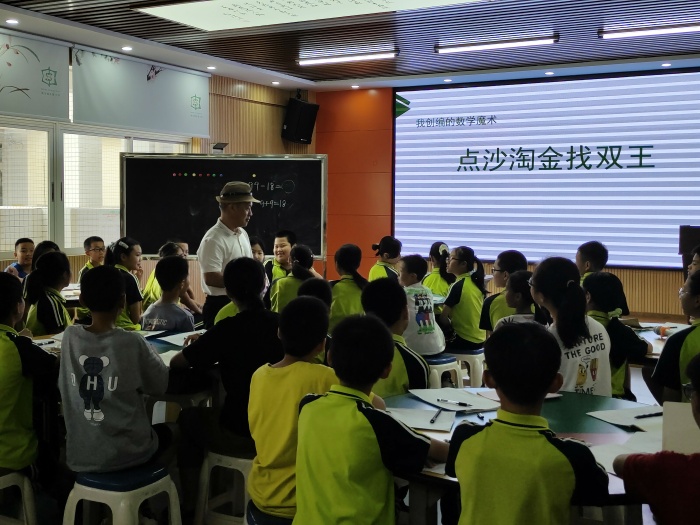 活動(dòng)開始,趙龍山教授走進(jìn)課堂,給南頭鎮(zhèn)的數(shù)學(xué)教師和升輝小學(xué)五(1)班的學(xué)生們帶來了精彩的指導(dǎo)課——《發(fā)現(xiàn)數(shù)學(xué)之美》。在課堂上,趙龍山教授充分展現(xiàn)了他獨(dú)特的個(gè)人魅力和深厚的教學(xué)功底,生動(dòng)地將“數(shù)字規(guī)律”稱為“數(shù)學(xué)之美”,用數(shù)字規(guī)律的串講提升了學(xué)生的數(shù)學(xué)思維。學(xué)生們?cè)诳鞓返挠螒?、魔術(shù)中體驗(yàn)到了無窮的樂趣,進(jìn)一步提高了學(xué)生學(xué)習(xí)數(shù)學(xué)的熱情。同時(shí),也給聽課教師們帶來了對(duì)數(shù)學(xué)學(xué)習(xí)的全新理解及思考。