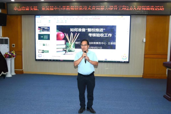 匯報結束后,何敏添主任對黃俊情老師展示的這節(jié)課例給予了充分的肯定,解讀了黃老師在課例中運用到的信息技術,并對應到相應的微能力點,而且這樣操作能恰如其分地發(fā)揮信息技術的優(yōu)勢,助力教師與學生,打造更高效的課堂。同時,也對這次課例教學設計的規(guī)范化撰寫進行了指導,建議在教學設計中明確教學環(huán)節(jié)中運用的信息技術及其作用作出相應的說明。并就匯報學校提交的整校驗收的資料,對照《能力提升工程2.0“整校推進”績效考核指標體系(中山)》詳細的介紹了各項資料上交中存在的問題及相應的規(guī)范化操作方法。橫欄鎮(zhèn)教育和體育事務中心王春明主任從整理材料清單、明晰考核要點、熟悉考核流程、關注考核細節(jié)四個方面對學校準備“整校推進”考核驗收工作進行指導。著重對“一劃兩案”的正確填寫逐項進行剖析與指導。強調要在態(tài)度上重視,在細節(jié)上下功夫,以特色來獲勝。