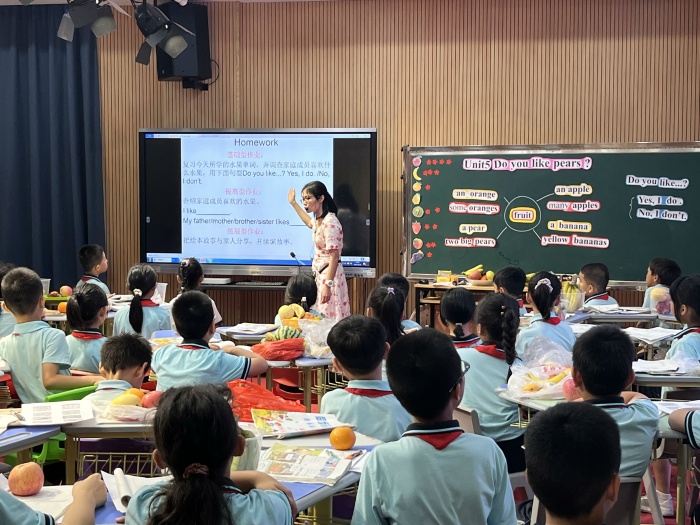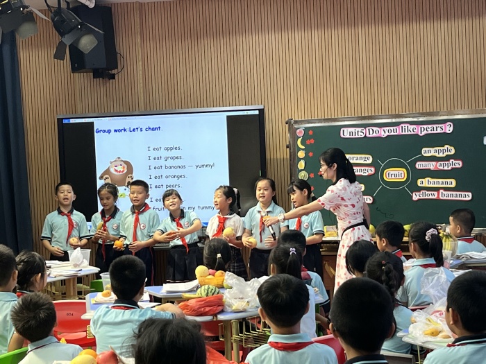 本次研討活動圍繞南頭鎮(zhèn)民安小學(xué)英語科組盧麗萍老師的課例展開,盧老師上課內(nèi)容是人教版三年級下冊unit5《 Do you like pears?》Part A Let’s learn&let’s chant,盧老師緊扣教學(xué)重難點(diǎn),有效整合智慧平臺上的豐富資源,設(shè)計(jì)了豐富多彩的聽、說、讀、寫等語言活動。學(xué)生們在體驗(yàn)、練習(xí)和交流中習(xí)得語言;在任務(wù)驅(qū)動下進(jìn)行小組合作探究并運(yùn)用語言;通過繪本閱讀拓展知識和深化語言。整堂課教學(xué)內(nèi)容充實(shí),教學(xué)環(huán)節(jié)緊密相扣,層層遞進(jìn),學(xué)生們?nèi)掏度肫渲胁⒋竽懕磉_(dá)自己的想法。