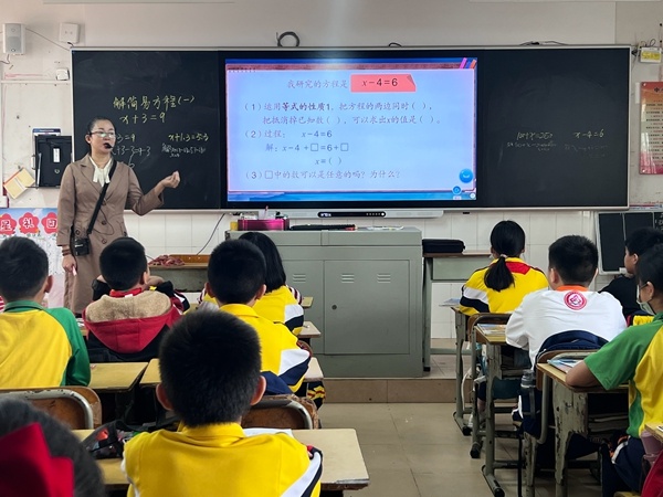 惠州市惠東縣多祝中心小學駐三角鎮(zhèn)高平小學跟崗行政溫運方副主任對“愛種子”教學模式進行深入研究,并借助“愛種子”互動探究教學平臺,為老師們展示了一節(jié)人教版小學數(shù)學五年級上冊《解簡易方程》的互動探究課。