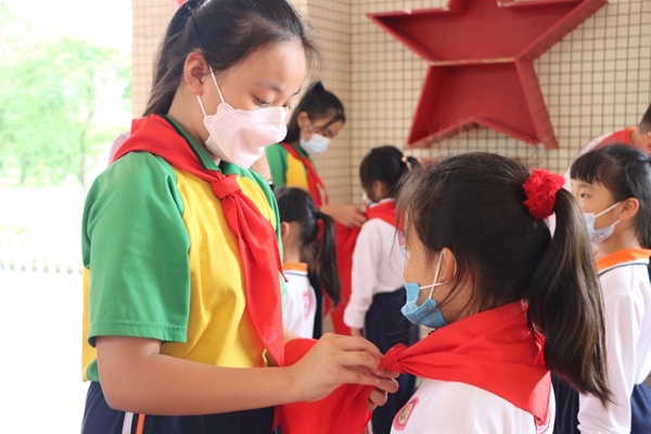伴隨著樂曲的悠揚(yáng)旋律,五年級老隊(duì)員為新隊(duì)員們佩戴紅領(lǐng)巾,并互敬隊(duì)禮,鮮艷的紅領(lǐng)巾在胸前飄揚(yáng),隊(duì)員們臉上滿溢著激動與自豪,這是他們光榮的時(shí)刻!接著,大隊(duì)長黃麗霞帶領(lǐng)新隊(duì)員們莊嚴(yán)宣誓。隨著新隊(duì)員入隊(duì),5個(gè)新的中隊(duì)也成立了,大隊(duì)輔導(dǎo)員梁嘉敏老師分別為一年級新聘輔導(dǎo)員頒發(fā)聘書,并為中隊(duì)授中隊(duì)旗。在熱烈的掌聲中,一(4)中隊(duì)趙梓晴同學(xué)代表新隊(duì)員發(fā)言,她用稚嫩而堅(jiān)定的聲音表達(dá)對老師和父母的感激,表達(dá)作為一名少先隊(duì)員的喜悅和自豪,并呼吁新隊(duì)員們要嚴(yán)格要求自己,向身邊的榜樣學(xué)習(xí),做新時(shí)代好隊(duì)員。隨后,德育主任黃潔玉進(jìn)行講話,她向新隊(duì)員們表示衷心的祝賀,并提出殷切期望。最后全體隊(duì)員在艷麗的隊(duì)旗下高舉右拳,跟著大隊(duì)輔導(dǎo)員梁嘉敏老師莊嚴(yán)地呼號,他們用稚嫩的聲音發(fā)出堅(jiān)定而有力的宣誓聲。呼號畢,退旗曲響起,全體少先隊(duì)員敬隊(duì)禮、目送隊(duì)旗,本次入隊(duì)儀式完滿結(jié)束。