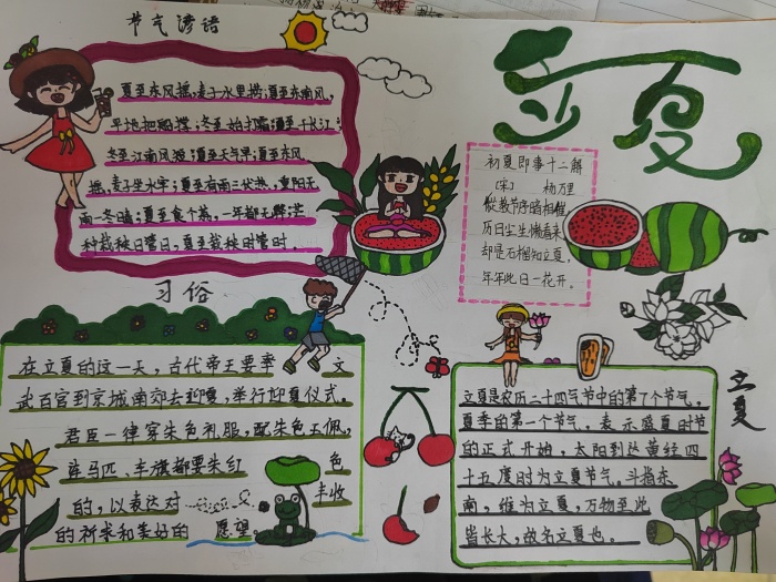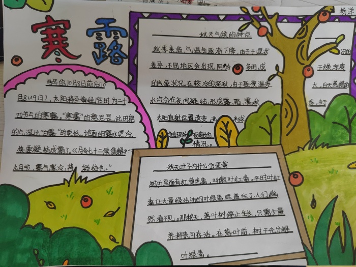 四到六年級的同學(xué)們通過制作色彩多樣、構(gòu)思巧妙、內(nèi)容豐富的手抄報來講述二十四節(jié)氣的來歷、傳說、農(nóng)事、農(nóng)諺等,也有同學(xué)分享了自己的感悟,學(xué)生在這個過程中不僅了解了二十四節(jié)氣,感受了中國歷法的內(nèi)涵,激起了探究傳統(tǒng)文化的興趣。