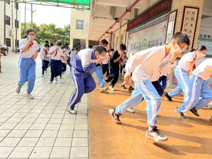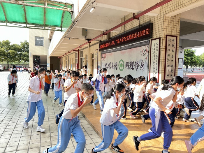 隨著一陣急促的警報(bào)聲,消防疏散演練正式開始。同學(xué)們?cè)谌握n老師的引導(dǎo)下,用濕毛巾捂住口鼻,彎腰俯身,迅速有序地按照預(yù)案的疏散線路逃離“火場(chǎng)”。經(jīng)過(guò)1分43秒的時(shí)間,所有師生被疏散到操場(chǎng)集合,各班主任迅速維持秩序,及時(shí)清點(diǎn)人數(shù),確保無(wú)一人遺漏,整個(gè)活動(dòng)井然有序。