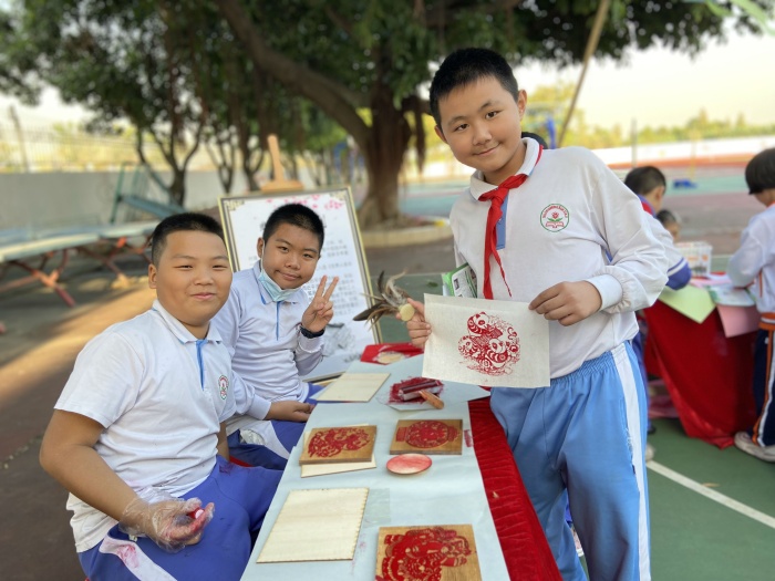 在傳統(tǒng)工藝攤位上,同學(xué)們圍坐一起,積極參與了陶藝、茶藝、剪紙、板畫(huà)、布染、再造紙、風(fēng)箏制作、毽子制作等傳統(tǒng)工藝制作,場(chǎng)面溫馨。