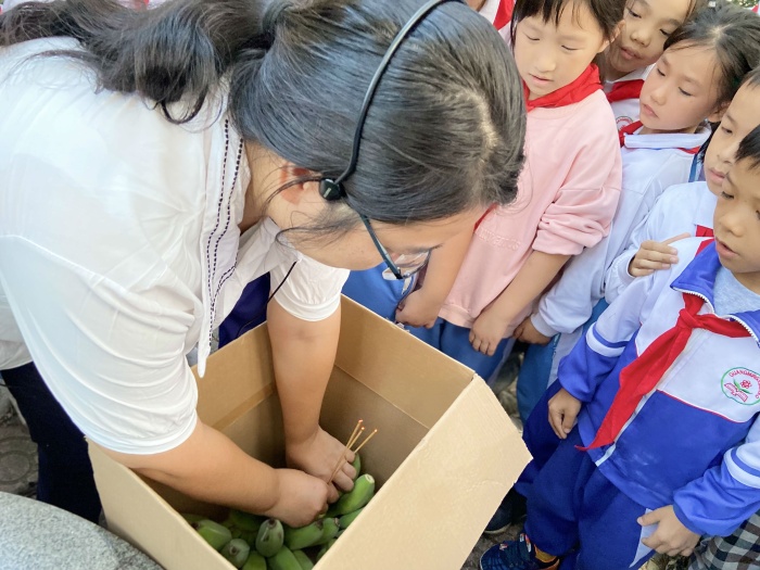 成熟的香蕉香又甜,那如何催熟香蕉呢?同學(xué)們好奇地圍著老師追問,認真聽完林主任講解香蕉成熟的過程后,,按照林主任的指引,分別采用了乙烯利催熟法、蘋果催熟法、熏煙催熟法,把摘下來的香蕉進行催熟試驗,并連續(xù)幾天對香蕉進行了氣味、顏色和硬度的觀察。