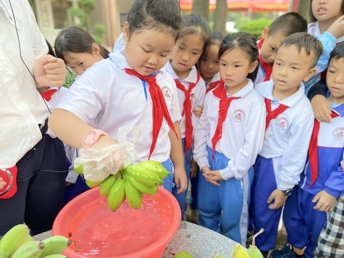 秋風(fēng)習(xí)習(xí),瓜果飄香,又到了豐收的季節(jié),學(xué)校附近的香蕉樹上掛滿了一串串待成熟的香蕉。11月1日,三角鎮(zhèn)光明小學(xué)開展“如何催熟香蕉”勞動實踐活動。