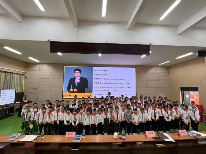 廣東省《少年講書(shū)人》電視展評(píng)活動(dòng)策劃人兼專家團(tuán)成員、國(guó)家高級(jí)演講師李哲老師和《少年講書(shū)人》組委會(huì)成員陳秀文老師等一行攜著“講書(shū)”春風(fēng)蒞臨三角鎮(zhèn)中心小學(xué),分享講書(shū)經(jīng)驗(yàn)。三角鎮(zhèn)教育和體育事務(wù)中心副主任梁文、中心小學(xué)校長(zhǎng)吳博事等全體行政、學(xué)校各班學(xué)生代表、文學(xué)社輔導(dǎo)老師和社員參與了此活動(dòng)。