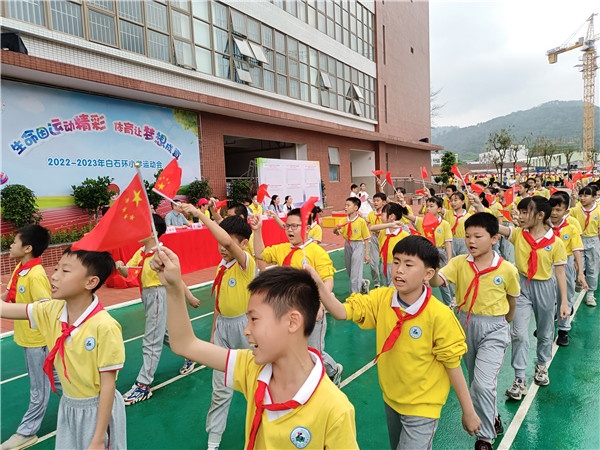 天公作美,剛才煙雨蒙蒙、細(xì)雨綿綿,轉(zhuǎn)而云淡風(fēng)輕,泥土氣香濃。上午8時(shí)20分,白石環(huán)小學(xué)1300多名師生和百名家長(zhǎng)義工齊聚籃球場(chǎng)準(zhǔn)備參加隆重的入場(chǎng)儀式和開(kāi)幕儀式。