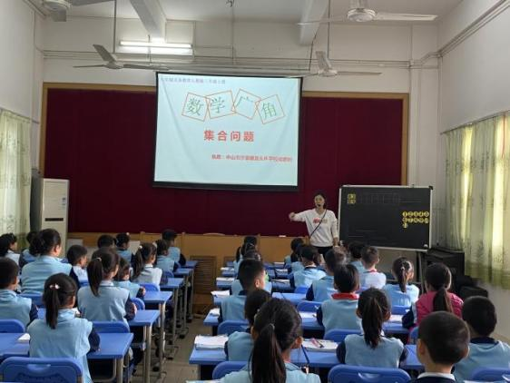 接著,鄭君時老師上示范課《集合問題》。鄭老師從一個腦筋急轉(zhuǎn)彎出發(fā),引出“既……又……”概念。隨后設(shè)立了四個環(huán)節(jié)進(jìn)行對集合的探究。第一環(huán)節(jié)利用題目語文組、數(shù)學(xué)組的人數(shù)設(shè)置沖突,引發(fā)學(xué)生思考。第二環(huán)節(jié),通過引導(dǎo)學(xué)生鉆進(jìn)呼啦圈的現(xiàn)實(shí)情境,體驗(yàn)沖突點(diǎn),整個過程讓學(xué)生發(fā)現(xiàn)問題、解決問題從而進(jìn)行突破。第三環(huán)節(jié),引導(dǎo)學(xué)生將號碼牌貼在黑板的圈圈里,學(xué)生嘗試多種方式的列式解答并闡述原因,在這個過程中學(xué)生逐漸清晰集合各部分代表的含義。第四環(huán)節(jié),學(xué)生利用點(diǎn)子圖牌一步一步演示,更深層次地挖掘集合的可能性。