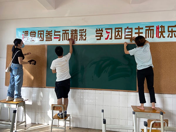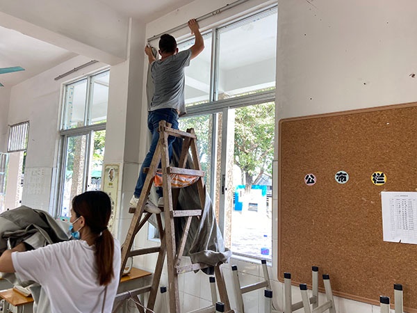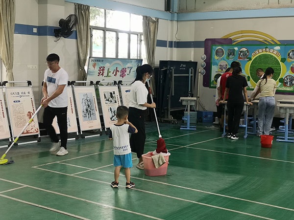 活動中,志愿親子及老師們認(rèn)真清理班級和校園的各個衛(wèi)生死角,家長義工們有的擦窗戶,有的清掃風(fēng)扇,有的清除班級門前花叢中的垃圾紙屑和大堂的落葉,忙得不亦樂乎,校園里盡是灑滿了汗水的歡聲笑語。在大家的共同努力下,整個校園煥然一新。