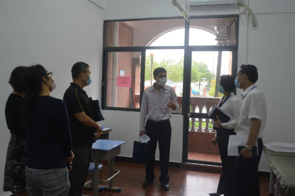 4月22日上午,由中山市教育和體育局、衛(wèi)健局、市場(chǎng)監(jiān)管局組成的學(xué)生返校疫情防控驗(yàn)收組蒞臨神灣育才學(xué)校開(kāi)展驗(yàn)收工作。
