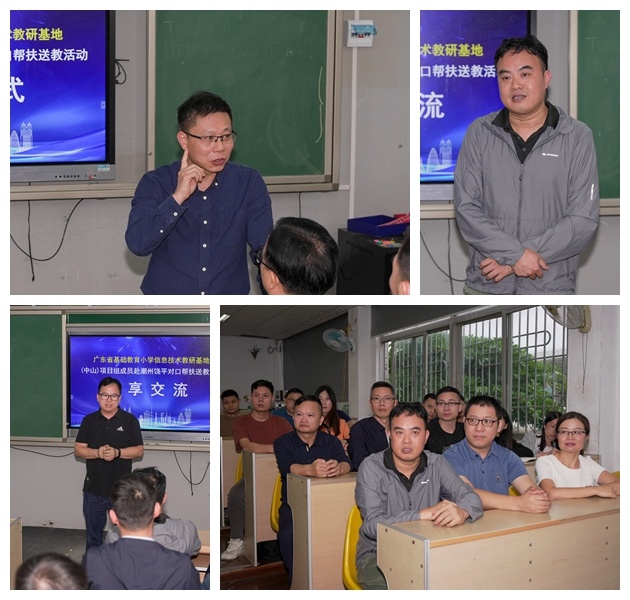 學(xué)有所思,行之有向?;顒?dòng)的最后,老師們齊聚一堂,就本次的對(duì)口幫扶送教活動(dòng)中的學(xué)習(xí)收獲進(jìn)行了交流分享,中山市南區(qū)良都小學(xué)鄧定波主任目前在饒平縣高堂鎮(zhèn)中心小學(xué)掛職副校長(zhǎng),他表示,非常感謝廣東省基礎(chǔ)教育小學(xué)信息技術(shù)教研基地項(xiàng)目(中山)在區(qū)域聯(lián)動(dòng)、教學(xué)、教研等方面的示范引領(lǐng)作用。陳明宏老師也對(duì)本次活動(dòng)進(jìn)行了總結(jié),陳老師指出此次“對(duì)口幫扶送教”活動(dòng),為老師們提供了互相交流展示的平臺(tái),促進(jìn)了教師間的教學(xué)互助,共享了優(yōu)質(zhì)的教育資源。