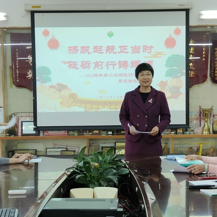 會議在劉曉君校長的祝福聲中拉開帷幕!劉校長以“揚帆啟航正當時 砥礪前行鑄輝煌”為主題,總結(jié)了上學期的各項工作,回顧了上一學期,在市教育體育局和石岐街道黨工委的關(guān)心下,在學校領(lǐng)導(dǎo)的不懈努力下,該校一體機覆蓋了全校15個班級,并且每個課室都安裝了新空調(diào)。改善了辦學條件,優(yōu)化了育人環(huán)境。這使學校的教學硬件設(shè)施建設(shè)實現(xiàn)了一次飛躍。同時,她總結(jié)了一學期以來學校取得的成績,對老師們凝心聚力搞教育、師生積極參加各項比賽并獲得優(yōu)異成績、老師們積極參加教研及課題研究表示充分的肯定。