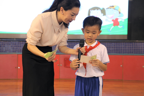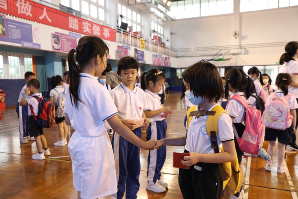 參觀完校園,小朋友們又在老師的帶領下進入活動中心參加互動活動。石岐中心小學一(1)班的林諾曦同學代表小學生發(fā)言,感謝幼兒園老師的培育,一定不辜負老師的期望,在小學好好學習,天天向上!機關三幼大(3)班的小朋友和一(1)班的小同學還互贈了書信。