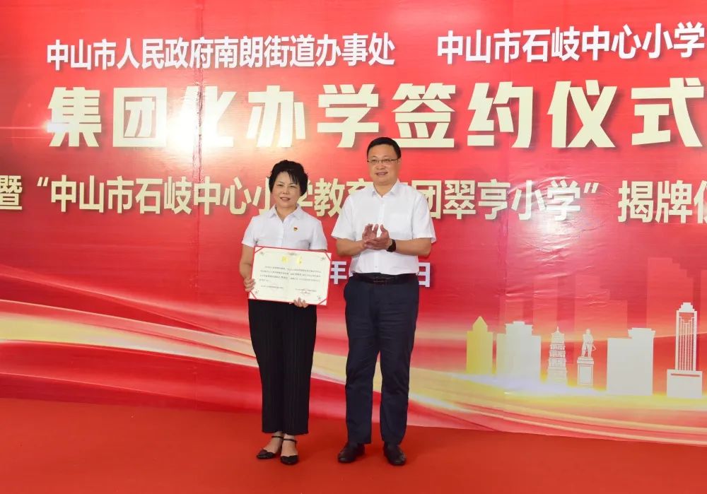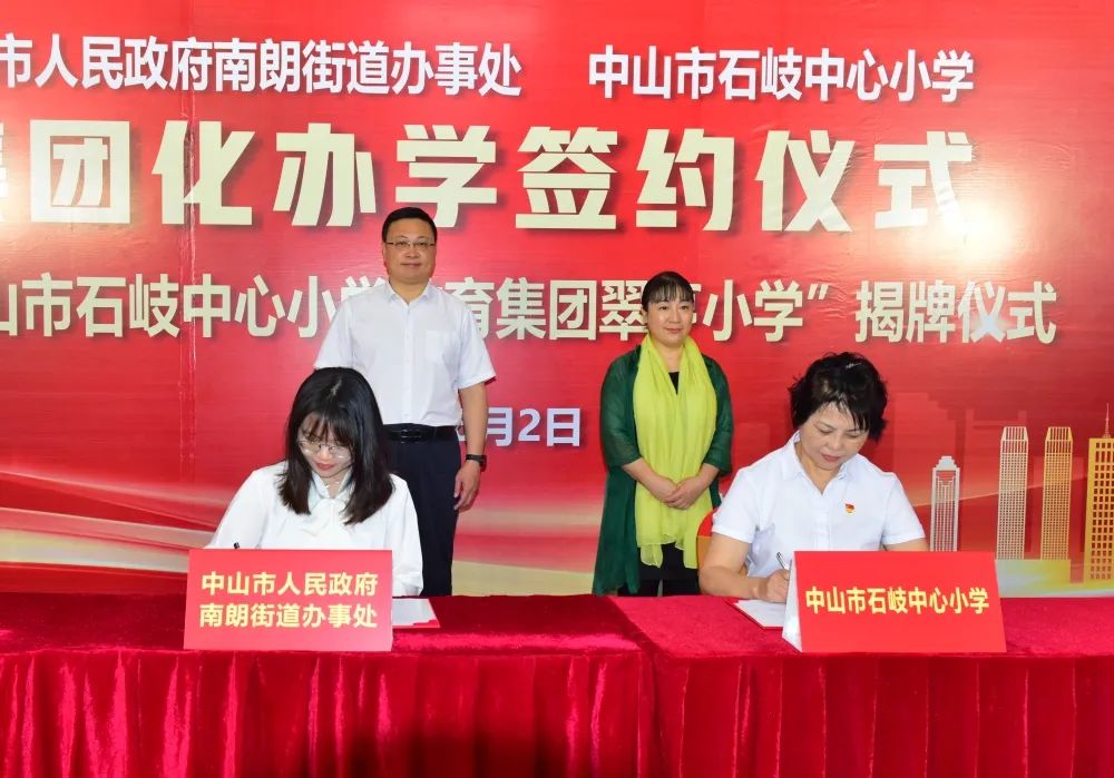 首先,在南朗街道黨工委副書記、辦事處主任許行,中山市教體局副局長(zhǎng)王志紅兩位領(lǐng)導(dǎo)的見證下,中山市石岐中心小學(xué)校長(zhǎng)周錦連與南朗街道辦事處副主任吳慧祺簽署了集團(tuán)化辦學(xué)協(xié)議。