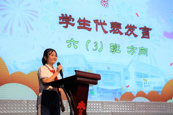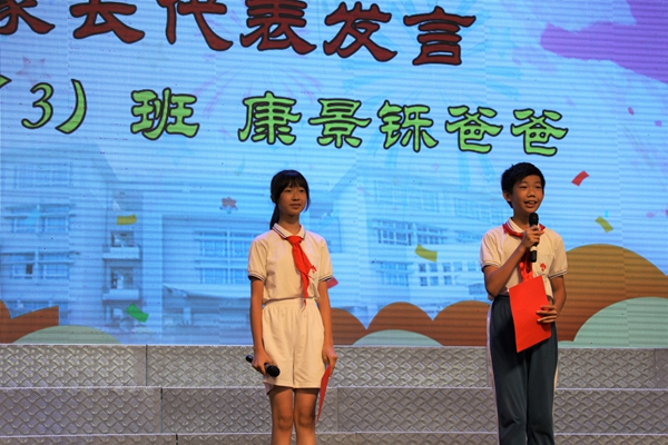六(3)班康景鑠同學(xué)的爸爸代表家長(zhǎng)發(fā)言。他感謝學(xué)校的領(lǐng)導(dǎo)和教師,秉承因材施教的教育理念,全心打造適合學(xué)生的教育,為孩子們營(yíng)造了一個(gè)溫馨安全的港灣,讓孩子彰顯與生俱來(lái)的天賦,引領(lǐng)孩子從混沌走向清明,從稚嫩走向成熟。同時(shí),他也代表家長(zhǎng)對(duì)所有的孩子提出期待,希望孩子們能保持三心:一是善良的心;二是進(jìn)取的心;三是勇敢的心。