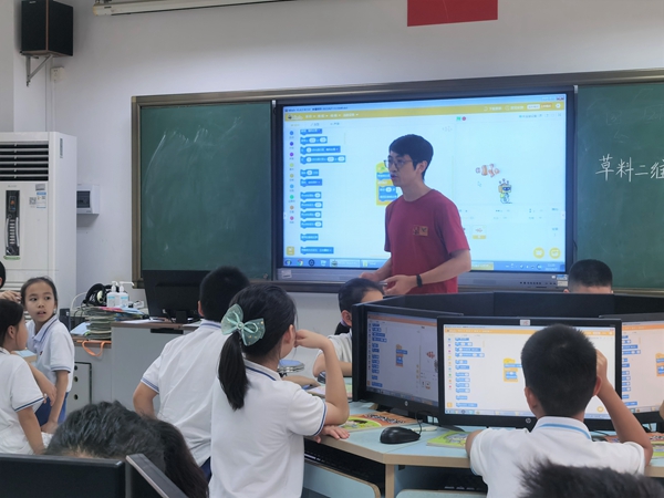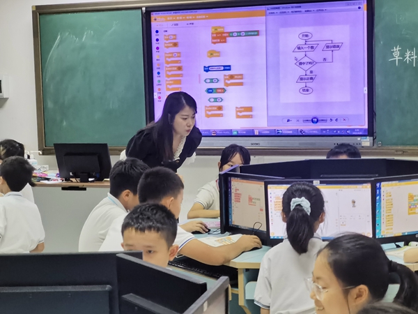 黃煒虹老師、周泳霏老師則針對(duì)五年級(jí)創(chuàng)意編程進(jìn)行課程打磨。黃煒虹老師執(zhí)教《小麥來玩球》一課,在完成基礎(chǔ)學(xué)習(xí)任務(wù)的同時(shí),注重培養(yǎng)學(xué)生的創(chuàng)新意識(shí),通過小組討論、匯報(bào)等形式,鼓勵(lì)學(xué)生拓展思維、表達(dá)想法,提升游戲趣味性。周泳霏老師執(zhí)教《小麥猜猜樂》一課,引導(dǎo)學(xué)生分析游戲流程,將問題層層分解、化簡(jiǎn),最終解決問題,引導(dǎo)學(xué)生對(duì)程序進(jìn)行迭代與優(yōu)化,培養(yǎng)學(xué)生的計(jì)算思維能力。