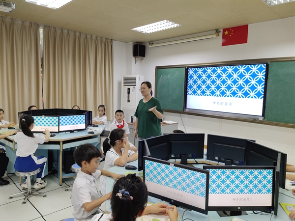 胡莉華老師、張敏滋老師、劉文東老師針對(duì)四年級(jí)趣味編程進(jìn)行課程打磨。胡莉華老師執(zhí)教《神奇的畫筆》一課,先引導(dǎo)學(xué)生思考并討論計(jì)算機(jī)編程軟件畫圖的優(yōu)勢(shì),不僅激發(fā)了學(xué)生學(xué)習(xí)興趣,更為培養(yǎng)學(xué)生數(shù)字化學(xué)習(xí)與創(chuàng)新能力打下基礎(chǔ)。胡老師注重學(xué)生探索創(chuàng)新能力的培養(yǎng),鼓勵(lì)學(xué)生舉一反三,進(jìn)行民族服飾的花紋設(shè)計(jì),并通過編程實(shí)現(xiàn)。張敏滋老師執(zhí)教《小麥捕魚》一課,通過引導(dǎo)學(xué)生實(shí)現(xiàn)魚兒水中游-小麥跟隨鼠標(biāo)移動(dòng)-繪制籃子-開始捕魚等幾個(gè)環(huán)節(jié)完成作品,鼓勵(lì)學(xué)生進(jìn)行創(chuàng)新任務(wù)的完成。劉文東老師《小麥彈球》一課,通過引導(dǎo)學(xué)生發(fā)現(xiàn)問題、解決問題,幫助學(xué)生突破本節(jié)課的重難點(diǎn),更在評(píng)價(jià)環(huán)節(jié)實(shí)現(xiàn)了生生互評(píng)與學(xué)生自評(píng)等多元化評(píng)價(jià)方式。