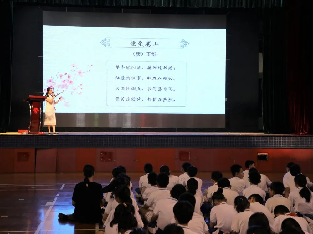 首先,林曉潔老師教給同學們品析詩詞的五個方法——看、聽、讀、唱、感,然后,和同學們一起走進“衛(wèi)國守土、匹夫有責”的詩詞欣賞。林老師從《詩經(jīng)》入手,帶領大家重章反復,一詠三嘆;接著,欣賞了李清照的《夏日絕句》、陸游的《示兒》、王維的《送元二使安西》和《使至塞上》……同學通過詩詞穿越歷史的長河,領略中華民族的滄桑往事,真切地感受歷史責任感。林老師的詩詞鑒賞精彩紛呈,在場的師生都被深深地感染和吸引了。