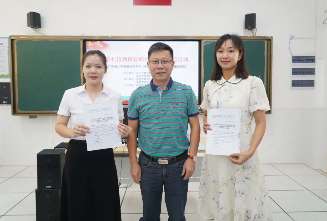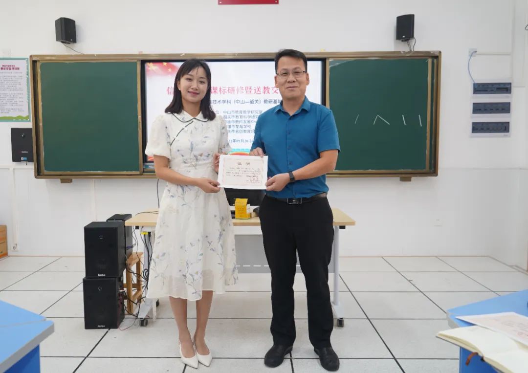 中山市教育教學研究室信息技術(shù)教研員陳明宏老師和省級教研基地負責人杏建紅主任分別給兩位老師頒發(fā)了送教證明。