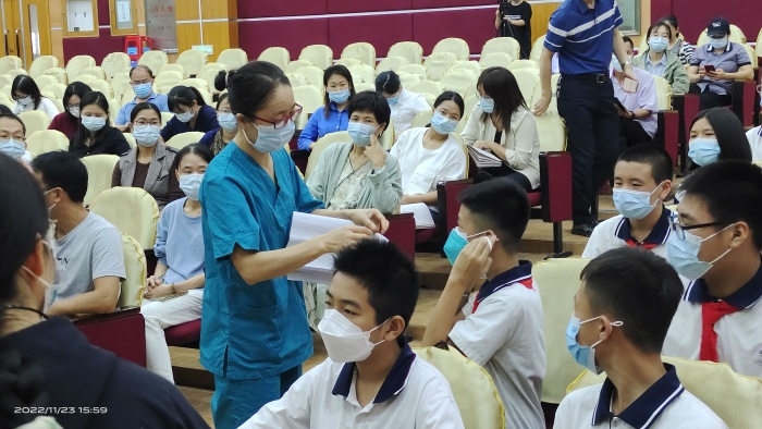 此后,安全后勤保障組迅速聯(lián)系校醫(yī)穿好防護(hù)服,戴好護(hù)目鏡,幫助該班新冠疑似病例更換N95口罩,帶至學(xué)校隔離室隔離,并聯(lián)系當(dāng)?shù)丶部夭块T進(jìn)行單人份核酸檢測(cè)并送檢(快速檢測(cè))。要求總務(wù)員布置核酸檢測(cè)點(diǎn),配合疾控機(jī)構(gòu)組織全校師生進(jìn)行核酸檢測(cè),并對(duì)確診學(xué)生所在班級(jí)教室和經(jīng)過的區(qū)域進(jìn)行全面消殺。學(xué)校安保人員封閉側(cè)門,并在學(xué)校正門拉好警戒線,張貼封閉管理通知,所有人員禁止出入,學(xué)校實(shí)行全封閉式管理。