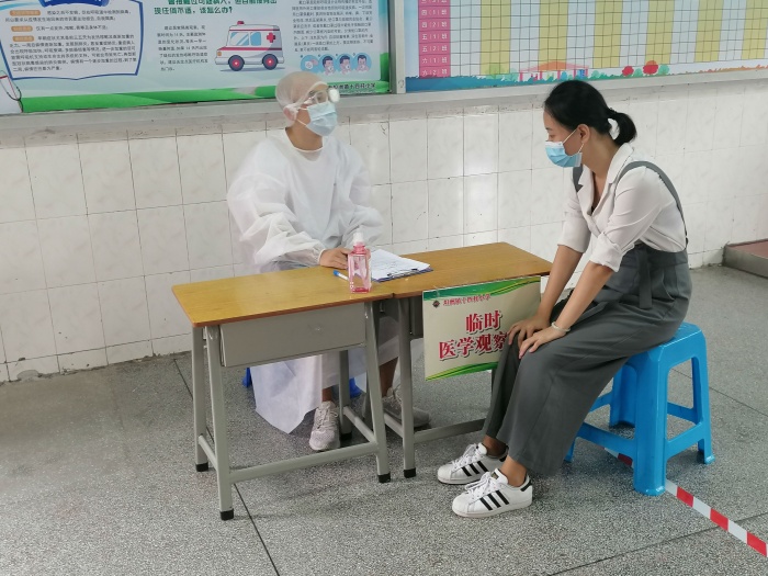 上午10點(diǎn)整,演練正式開始。其中著重演練課中突發(fā)事件的情景令人印象深刻,各位老師都投入到安排好的角色中。上課期間,一名學(xué)生報(bào)告老師不舒服課,有咳嗽和嘔吐癥狀。上課老師隨即指揮班干部轉(zhuǎn)移其他學(xué)生,通知醫(yī)學(xué)觀察老師處理。該生來到留觀室醫(yī)學(xué)觀察老師初步了解生病學(xué)生的情況,了解其近14天內(nèi)流行病學(xué)史。經(jīng)過測(cè)溫發(fā)現(xiàn)學(xué)生體溫異常,初步判斷其為非新冠肺炎可疑病例。緊接著,醫(yī)學(xué)觀察老師讓班主任老師通知家長(zhǎng)到校接生病學(xué)生就醫(yī)。隨后,醫(yī)學(xué)觀察老師把情況報(bào)告學(xué)校領(lǐng)導(dǎo)。整個(gè)演練過程有條不紊。