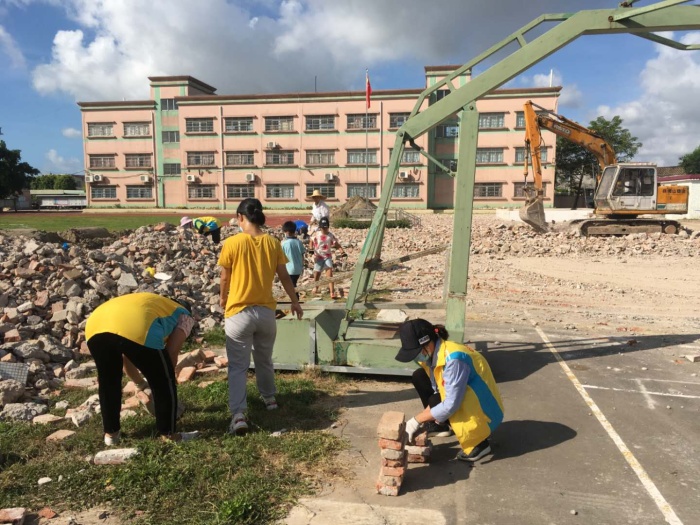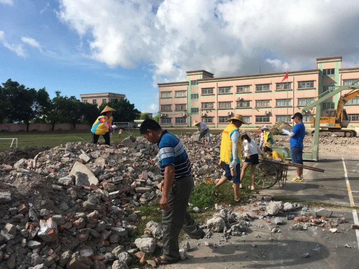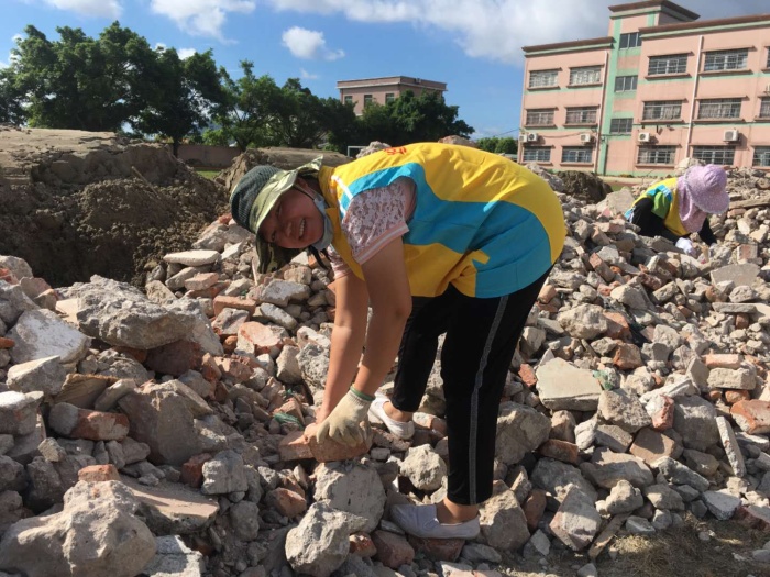 7月28日上午,在新合小學(xué)范田華校長的倡議下,由德育主任盧國慶組織安排,各班主任積極發(fā)動(dòng)家長及學(xué)生回校參與對(duì)已拆除的學(xué)校教學(xué)樓中有再次使用價(jià)值的磚塊撿出來的親子志愿活動(dòng)。家長們、老師們組成的志愿者隊(duì)伍迅速、有序地投入活動(dòng),一部分志愿者負(fù)責(zé)篩選有價(jià)值的磚塊,一部分志愿者負(fù)責(zé)用推車把磚塊運(yùn)到固定存放的地點(diǎn),烈日當(dāng)空,志愿者們都在貢獻(xiàn)自己的力量,有幾個(gè)高年級(jí)的學(xué)生已經(jīng)汗流浹背了,但臉上依然露出開心的笑臉。雖然天氣很惡劣,但是志愿者們都是迅速喝了水馬上又投入工作了。整個(gè)志愿活動(dòng)持續(xù)兩個(gè)多小時(shí),志愿者們?cè)谶@片廢墟下留下了美麗的倩影。