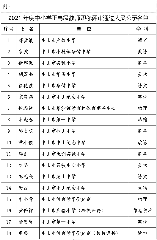 附:2021年度中山市中小學正高級教師職稱評審通過人員名單