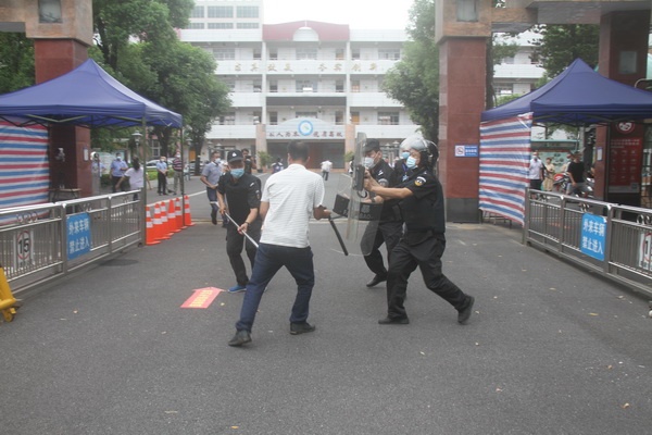 演練過程主要模擬一暴徒在校門口與安保人員發(fā)生矛盾,產(chǎn)生仇恨心理,遂轉(zhuǎn)身拿出兇器,追打保安人員,強(qiáng)行闖入校園。門衛(wèi)發(fā)現(xiàn)恐怖分子襲擊后,立即進(jìn)行阻止并發(fā)出警報(bào)信號(hào)。護(hù)校隊(duì)員迅速出動(dòng),他們以3人為作戰(zhàn)單位,正面一人使用盾牌,抵御襲擊,掩護(hù)側(cè)面隊(duì)員反擊。側(cè)面隊(duì)員使用鋼叉叉腳,棍棒協(xié)防的戰(zhàn)術(shù),對(duì)其進(jìn)行攔截,制止并控制其恐怖行為。其他人員負(fù)責(zé)保護(hù)和組織師生遠(yuǎn)離并躲避。由于門衛(wèi)及護(hù)校隊(duì)員反應(yīng)及時(shí),齊心協(xié)力,與恐怖分子展開勇敢搏斗,最終恐怖分子被制服,防止了損害行為的進(jìn)一步發(fā)生。其他師生沉著應(yīng)對(duì),疏散有序。