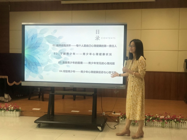 講座上,梁劍玲老師分別從“教師自我關(guān)懷”“了解青少年”“清楚青少年的困境”“幫助青少年”四個方面,以看圖片、講案例、小游戲、互動交流等多種方式教老師們?nèi)绾闻袛嘈睦斫】蹬c異常、如何遵循個體心理發(fā)展規(guī)律施教、如何應(yīng)對青少年心理健康問題等。講座貼近教師生活,案例生動形象、問題發(fā)人深省、講解深入淺出,不僅提高了教師們對心理健康及其意義的認(rèn)識,還使老師們掌握了在繁忙的學(xué)習(xí)、工作、生活中基本的心理調(diào)試方法,更增強(qiáng)了教師對學(xué)生心理健康問題的促進(jìn)與干預(yù)能力。