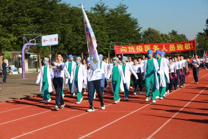 初一年級同學們身著各種職業(yè)服裝,致敬醫(yī)生護士、社區(qū)疾控、公安民警、交通警察、消防警察、快遞小哥、物流司機、送菜農(nóng)民、建設工人、北斗導航工程師、5G技術人員工人、化身主播實施線上教學的老師、志愿者……口號、橫幅、展板等將他們的故事展演,向偉大的時代英雄致敬。