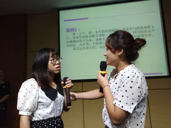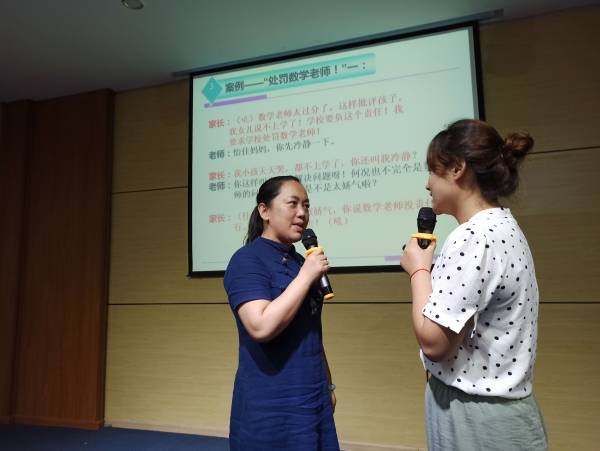 通過(guò)學(xué)生與老師、家長(zhǎng)與老師的案例演練,老師們了解到溝通的技巧。理論與實(shí)踐相結(jié)合的模擬場(chǎng)面讓現(xiàn)場(chǎng)氣氛推上高潮。老師們積極參與,與彭老師傾情互動(dòng),精彩表演溝通中的片段故事,現(xiàn)場(chǎng)笑聲不斷,其樂(lè)融融。于詼諧幽默中傳授溝通的藝術(shù),在輕松愉悅中提高自己的素養(yǎng)。 其中,在案例二“當(dāng)家長(zhǎng)與老師發(fā)生沖突時(shí),班主任應(yīng)該怎么做?”中,路海云校長(zhǎng)將自己的親身經(jīng)歷帶進(jìn)本次培訓(xùn),讓老師們明白,處理任何糾紛,學(xué)會(huì)傾聽(tīng),堅(jiān)持底線(xiàn),積極溝通,更容易達(dá)成一致。