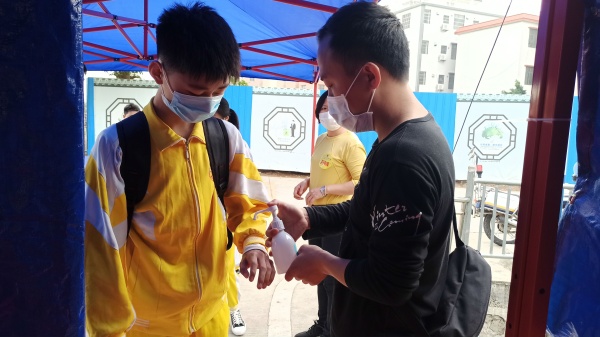 4月27日上午,聚星學(xué)校門口早已站著等待孩子們返校的班主任、老師。在聚星學(xué)校正門,孩子們根據(jù)老師的要求,有序地排成了間隔一米的隊形,經(jīng)過紅外線測試儀體溫測試、消毒后進入校園。進入校園后,孩子們也不扎堆自覺單行、有條不紊按照要求排隊交健康卡、測量體溫、消毒、到洗手池洗手消毒,排隊上樓進入班級。為了學(xué)生進入校園時不產(chǎn)生扎堆的現(xiàn)象,聚星學(xué)校實行錯峰上學(xué),讓同學(xué)們錯開班級、時間進入校園。