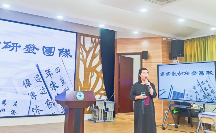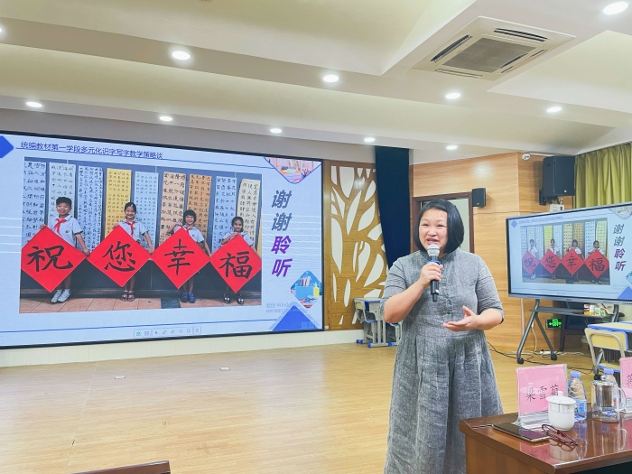 隨后,小欖教體文旅局蔣陽(yáng)曄老師為在座全體老師做了寫字指導(dǎo)經(jīng)驗(yàn)介紹。蔣老師全面細(xì)致地介紹了小欖鎮(zhèn)這些年在寫字教學(xué)方面的具體做法與所取得的成績(jī),并慷慨分享“寫字教學(xué)五步法”,讓在場(chǎng)的老師收獲滿滿。