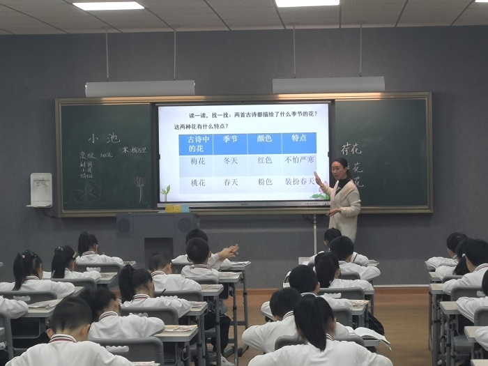 活動(dòng)中,課題組成員周泉老師在西區(qū)中心小學(xué)廣豐校區(qū)一(2)班執(zhí)教一節(jié)以《古詩(shī)中的花》為題的群詩(shī)閱讀教學(xué)課例。上課伊始,周老師帶領(lǐng)學(xué)生品析古詩(shī)《小池》,通過(guò)播放初夏小池圖片,詩(shī)的韻味便悄然彌漫于整個(gè)課堂,彌漫于學(xué)生的心中。課中,教師以古詩(shī)小組活動(dòng)為抓手,通過(guò)聲情并茂的描繪,播放多彩優(yōu)美的圖畫(huà),聲情并茂地朗讀,再現(xiàn)初夏小池的美景,借助課文插圖及多媒體課件的呈現(xiàn),幫助學(xué)生理解詩(shī)句的意思,從而使其體會(huì)詩(shī)中美麗的自然景色并產(chǎn)生聯(lián)想,激發(fā)學(xué)生在多向互動(dòng)的課堂氛圍中深入閱讀、感悟古詩(shī)。整節(jié)課把學(xué)生帶入古詩(shī)所描繪的意境中,學(xué)生在幽靜的“小池”美景中徜徉。最后,進(jìn)行對(duì)比閱讀《梅花》《惠崇春江晚景》兩首古詩(shī),學(xué)生完成群詩(shī)表格。一節(jié)課就像一首心靈流動(dòng)的樂(lè)章,似一篇文心涌動(dòng)的詩(shī)篇,引人入勝。