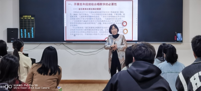 隨后,市級課題《小學(xué)低年段班級合唱教學(xué)實踐研究》主持人煙洲小學(xué)黃秋玲老師開展了題為《小學(xué)低年段班級合唱教學(xué)策略分析》的講座。黃老師通過分析《國務(wù)院辦公廳關(guān)于全面加強和改進(jìn)學(xué)校美育工作的意見》和《義務(wù)教育藝術(shù)課程標(biāo)準(zhǔn)(2022版)》指出在小學(xué)低年段開展合唱教學(xué)的必要性,結(jié)合中山市中小學(xué)生音樂能力底線標(biāo)準(zhǔn)的教學(xué)要求,提出在小學(xué)低年段開展班級合唱的教學(xué)策略:改編教材歌曲,讓合唱教學(xué)有米可炊;運用柯爾文手勢提高學(xué)生的音準(zhǔn)水平;運用節(jié)奏讀法培養(yǎng)學(xué)生的節(jié)奏感;運用豐富的形式訓(xùn)練學(xué)生的合唱能力;運用熟悉的歌曲進(jìn)行二聲部練習(xí)。黃老師在講座中特別強調(diào)在低年段實施班級合唱教學(xué)必須建立在準(zhǔn)確歌唱的基礎(chǔ)上。