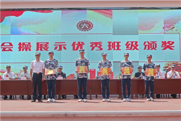 12個班級分成三組方隊進行會操表演,正步走,齊步走,排面整齊,口號響亮,擺臂、敬禮、跨立,每個動作剛勁威武,任汗水揮灑,任熱血澎湃,彰顯出磅礴的活力和堅定的意志。隨后的軍體拳表演中,沖、踢、擋、勾,揮一拳、打一式,一令一動,流暢自然,打得虎虎生風,方寸之間,7天磨煉的成果盡顯?!吨袊恕肥终Z操表演整齊劃一,氣勢如虹,表達了身為華夏子女的自豪和對祖國的赤子之心。