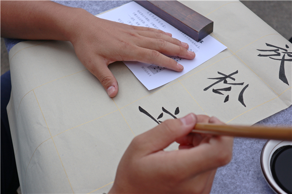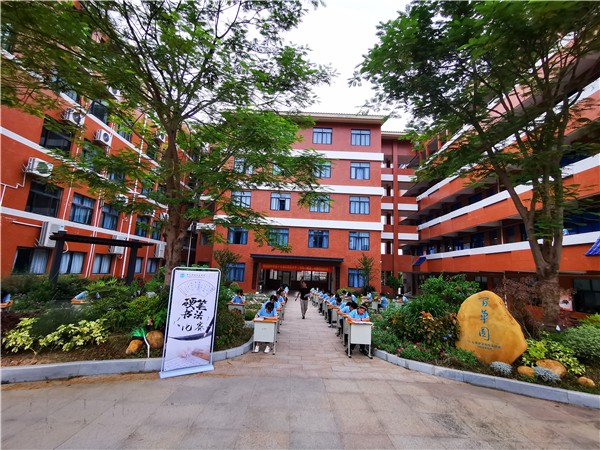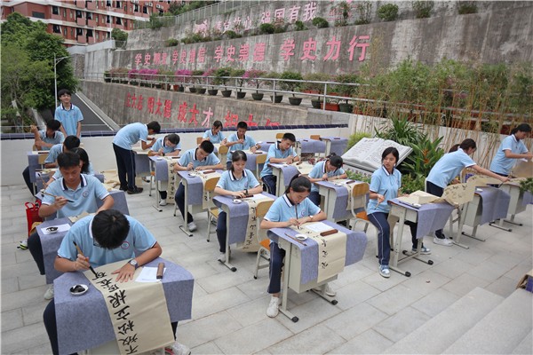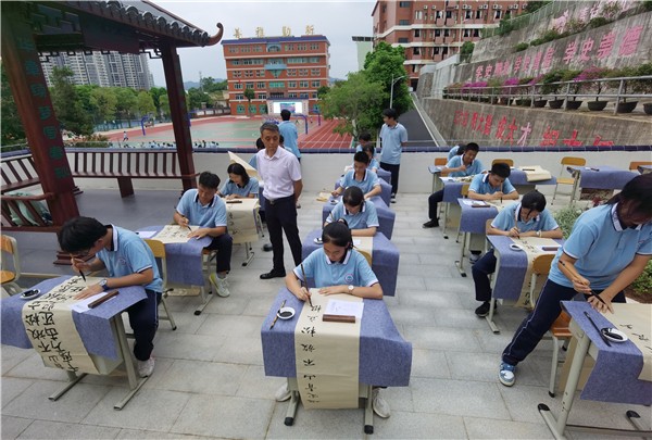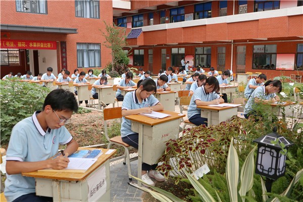 今年的書(shū)法比賽場(chǎng)地首次設(shè)在學(xué)校新增的兩個(gè)景觀點(diǎn),毛筆書(shū)法是芳華亭,硬筆書(shū)法是百草園。草木掩映,流水淙淙,舒緩的音樂(lè)縈繞耳旁,書(shū)法比賽區(qū)一片寧?kù)o悠揚(yáng),參賽者們靜心書(shū)寫(xiě),人文書(shū)香浸潤(rùn)其中。