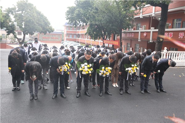 升旗禮后,高一高二年級(jí)返回班級(jí),由班主任再作教育。高三年級(jí)和學(xué)校行政則來(lái)到楊仙逸將軍銅像前,瞻仰銅像、默哀并獻(xiàn)花。隨后,師生拾級(jí)而上,繞徑殲五戰(zhàn)機(jī)上西林山航空文化園,在園內(nèi)的念慈亭下駐足列隊(duì),祭拜程度純和楊添靄母子。在一片安靜肅穆的氣氛中,老師們獻(xiàn)上手中鮮花,高三各班學(xué)生把手制紙花和紙飛機(jī)放在墓前,表達(dá)哀悼和無(wú)盡敬仰。