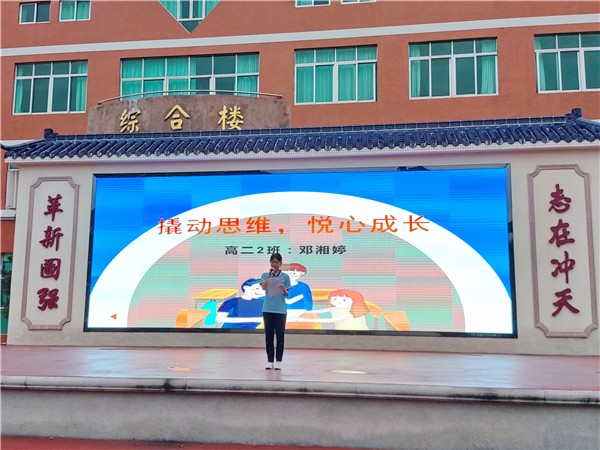 在國旗下講話環(huán)節(jié),高二2班的鄧湘婷同學(xué)做了題為《撬動思維 悅心成長》的主題演講。她從心理健康、緩解壓力等方面進(jìn)行闡釋,并結(jié)合了自身學(xué)習(xí)生活經(jīng)歷,強(qiáng)調(diào)了撬動思維的重要性,號召大家要注重心理健康,學(xué)會撬動思維,塑造健康心理。