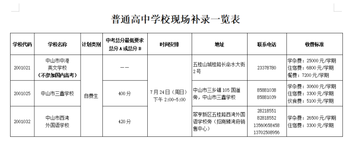 中山市2022年普通高中統(tǒng)一投檔錄取工作已于7月22日完成。目前,中港英文學(xué)校、中山市三鑫學(xué)校、中山市西灣外國語學(xué)校等民辦學(xué)校尚有少量自費生計劃未完成?,F(xiàn)定于7月24日(周日)下午2:00-5:00進(jìn)行現(xiàn)場補錄工作,請符合相關(guān)條件、有意向入讀的考生和家長于指定時間前往學(xué)校進(jìn)行書面申請(具體詳見附件)。
